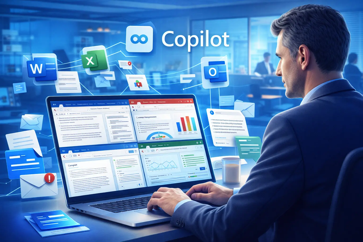 O Microsoft Copilot no Microsoft 365 automatiza tarefas repetitivas, resume reuniões no Microsoft Teams, gera relatórios no Microsoft Excel, redige e-mails no Microsoft Outlook e cria documentos no Microsoft Word, aumentando produtividade em até 30% quando bem configurado e governado.